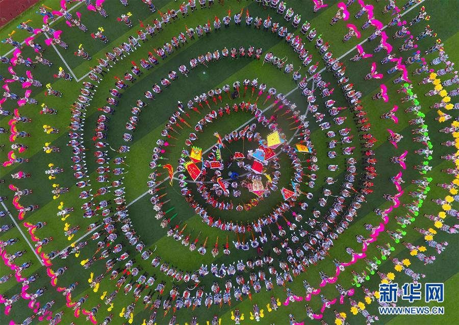 在廣西融水苗族自治縣民族體育公園,當?shù)厝罕娫谔J笙斗馬節(jié)開幕式上表演歌舞(無人機照片,2017年11月18日攝)。新華社記者黃孝邦攝