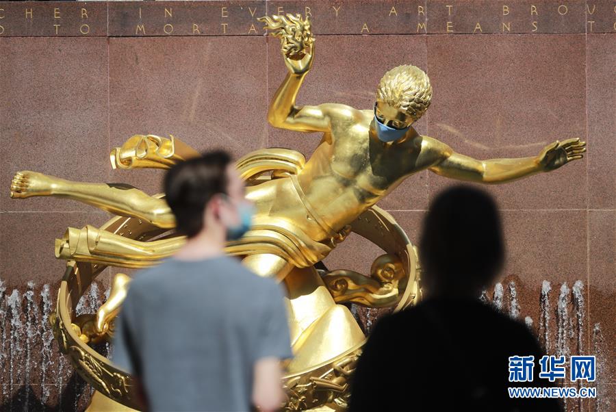 6月22日,在美國紐約洛克菲勒中心,一座雕像被“戴”上口罩。美國約翰斯·霍普金斯大學22日發(fā)布的新冠疫情最新統(tǒng)計數(shù)據顯示,美國累計死亡病例超過12萬例。新華社記者王迎攝