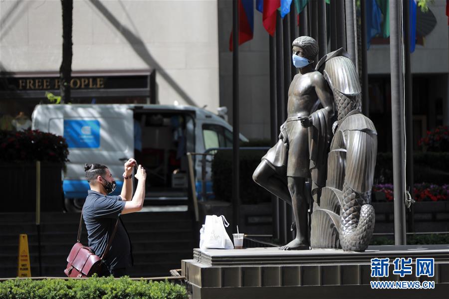 6月22日,在美國紐約洛克菲勒中心,一座雕像被“戴”上口罩。美國約翰斯·霍普金斯大學(xué)22日發(fā)布的新冠疫情最新統(tǒng)計數(shù)據(jù)顯示,美國累計死亡病例超過12萬例。新華社記者王迎攝