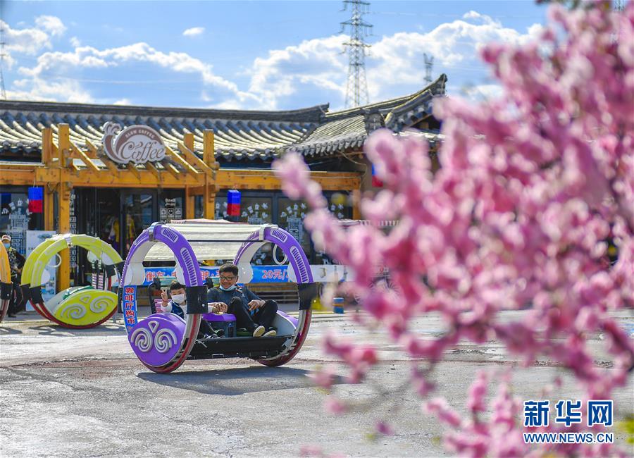在吉林省延邊朝鮮族自治州和龍市西城鎮(zhèn)金達萊民俗村,村民在村內的咖啡館前體驗親子游樂項目(5月6日攝)。新華社記者許暢攝