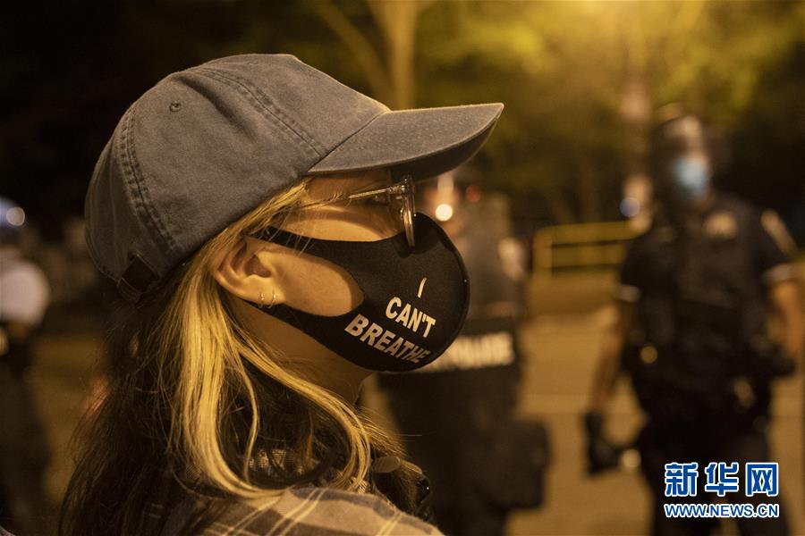6月22日,一名女子戴著寫有“我不能呼吸”的口罩在美國華盛頓白宮附近參加示威活動。美國警察和示威者22日晚在首都華盛頓市白宮北側拉斐特廣場發(fā)生沖突并對峙。美國總統(tǒng)特朗普在社交媒體上說,許多人因破壞廣場上美國前總統(tǒng)安德魯·杰克遜的雕像及附近圣約翰圣公會教堂被逮捕。新華社記者劉杰攝