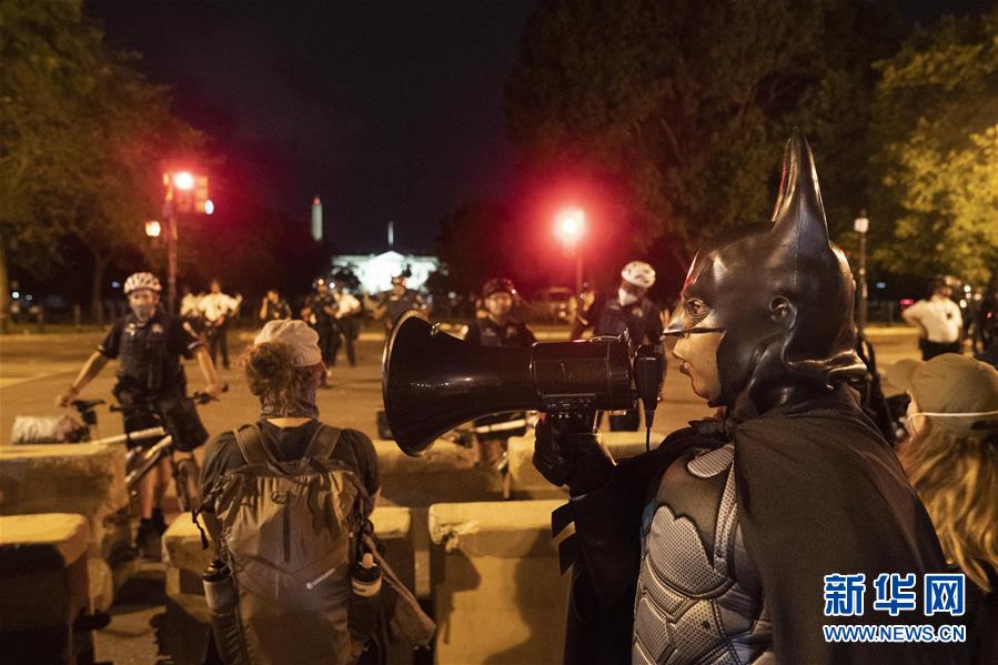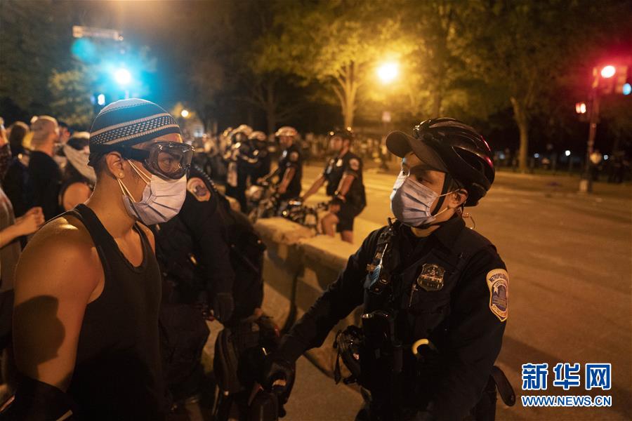 6月22日,警察在美國華盛頓白宮附近警戒。美國警察和示威者22日晚在首都華盛頓市白宮北側拉斐特廣場發(fā)生沖突并對峙。美國總統(tǒng)特朗普在社交媒體上說,許多人因破壞廣場上美國前總統(tǒng)安德魯·杰克遜的雕像及附近圣約翰圣公會教堂被逮捕。新華社記者劉杰攝