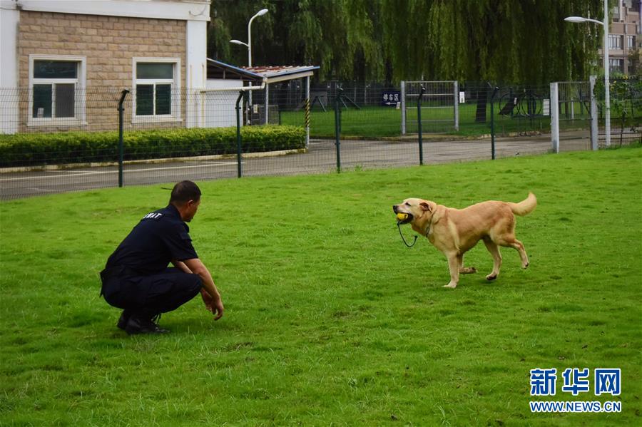 6月24日,訓(xùn)導(dǎo)員周吉榮和緝毒犬“多多”在訓(xùn)練場(chǎng)上互動(dòng)。 新華社記者 鄭夢(mèng)雨 攝