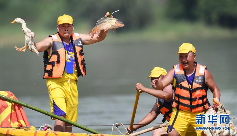 6月25日,參賽選手將放歸漢江中的鴨子抓到手中,鉆出水面,舉過(guò)頭頂,引來(lái)岸上一片歡呼。龍舟賽最引人注目的是搶鴨子、抓鯉魚。新華社記者 陶明 攝