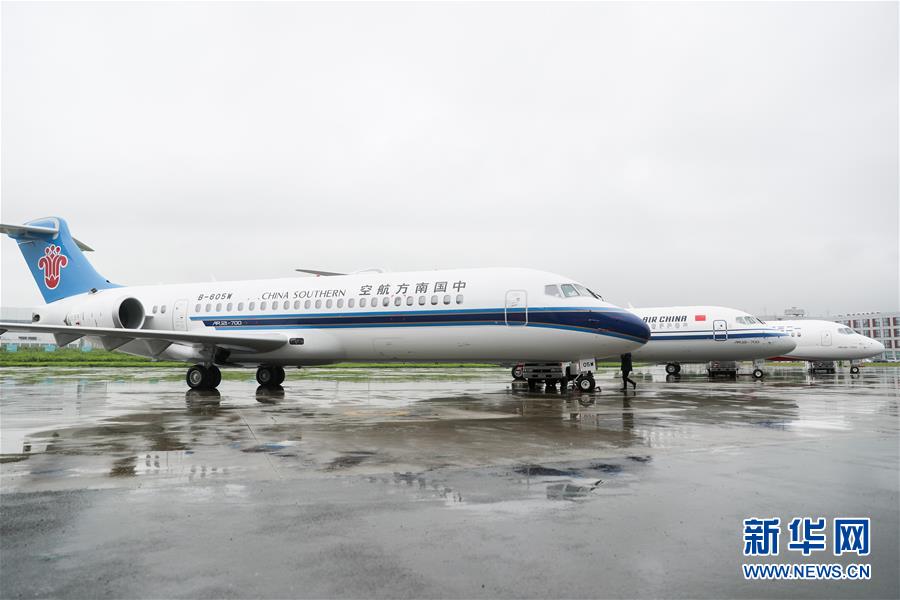 6月28日,三架嶄新涂裝的國(guó)產(chǎn)新支線客機(jī)ARJ21飛機(jī)停放在中國(guó)商用飛機(jī)有限責(zé)任公司總裝基地內(nèi)。當(dāng)日,三架嶄新涂裝的國(guó)產(chǎn)新支線客機(jī)ARJ21飛機(jī)在位于上海浦東的中國(guó)商用飛機(jī)有限責(zé)任公司總裝基地集結(jié),分別交付給國(guó)航、東航、南航三大航空公司,標(biāo)志著ARJ21進(jìn)入我國(guó)主流民航市場(chǎng)。新華社記者丁汀攝