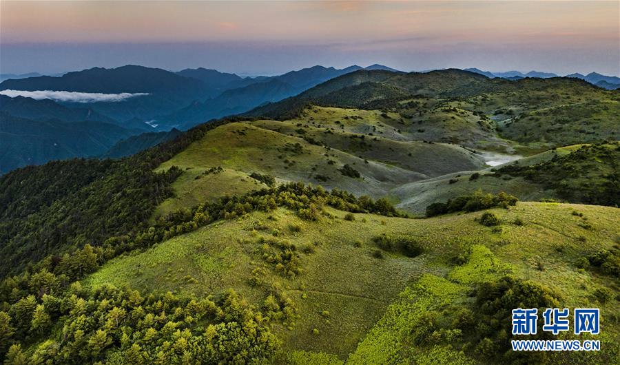 6月30日,晨曦中的神田草甸(無人機(jī)照片)。位于陜西省安康市嵐皋縣與重慶市城口縣交界處大巴山神田主脊北坡的神田草甸,面積超過1.1萬畝。夏日的朝霞中,起伏的草甸仿佛一塊寬大無邊的綠色地毯,鑲嵌在大巴山上,如詩如畫。新華社記者陶明攝