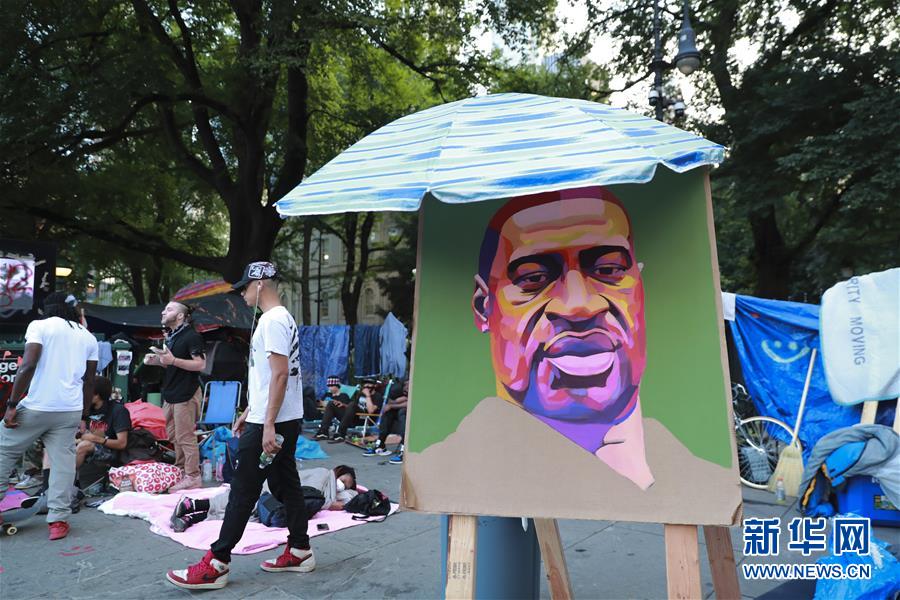 這是6月30日在美國(guó)紐約市政廳外“占領(lǐng)市政廳”抗議活動(dòng)現(xiàn)場(chǎng)拍攝的弗洛伊德畫像。由美國(guó)明尼蘇達(dá)州明尼阿波利斯市非裔男子弗洛伊德遭白人警察暴力執(zhí)法而死一事引發(fā)的各種抗議活動(dòng)仍在紐約持續(xù)進(jìn)行。新華社記者王迎攝