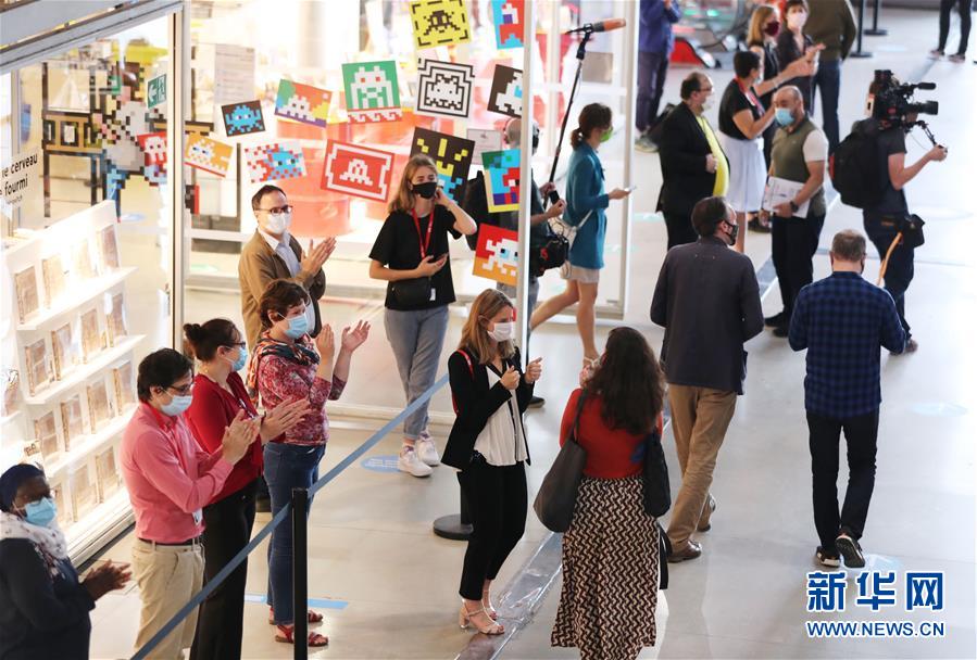 7月1日,法國(guó)巴黎蓬皮杜藝術(shù)中心的工作人員鼓掌歡迎參觀者。因新冠疫情關(guān)閉的法國(guó)巴黎蓬皮杜藝術(shù)中心于7月1日重新開(kāi)門(mén)迎客。目前,中心只開(kāi)放6層的臨時(shí)展區(qū)和4、5層的現(xiàn)代藝術(shù)常設(shè)展區(qū)。參觀者需提前網(wǎng)上預(yù)約參觀時(shí)段,11歲以上參觀者須佩戴口罩,參觀過(guò)程中保持安全距離。新華社記者高靜攝