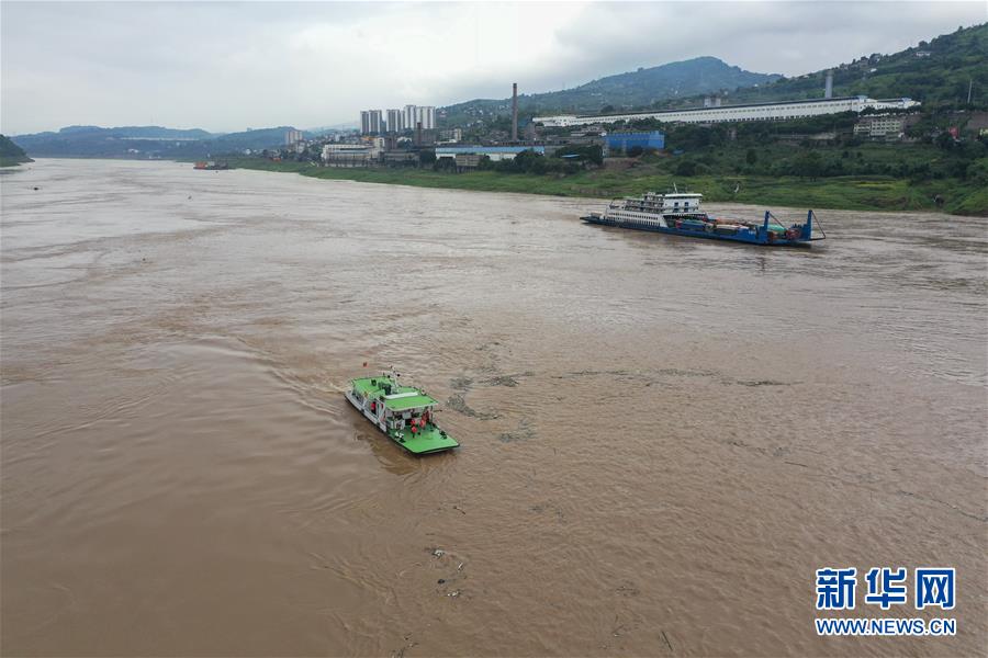 7月2日,長(zhǎng)江清溪場(chǎng)水文站的水文作業(yè)船(左)在長(zhǎng)江上進(jìn)行水文測(cè)量作業(yè)(無(wú)人機(jī)照片)。新華社記者劉潺攝