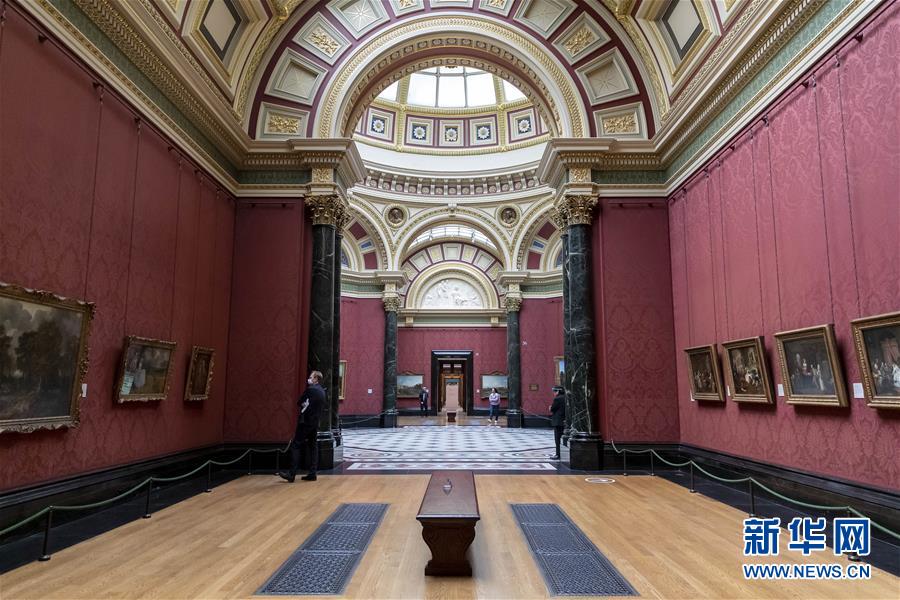 7月4日,參觀者佩戴口罩在英國國家美術(shù)館的媒體開放日上參觀。受新冠疫情影響而關(guān)閉的英國國家美術(shù)館將于7月8日重新對公眾開放,成為倫敦首批開門迎客的博物館、美術(shù)館。參觀者需提前網(wǎng)上預(yù)約參觀時(shí)段,全程佩戴口罩且保持安全距離。新華社記者韓巖攝