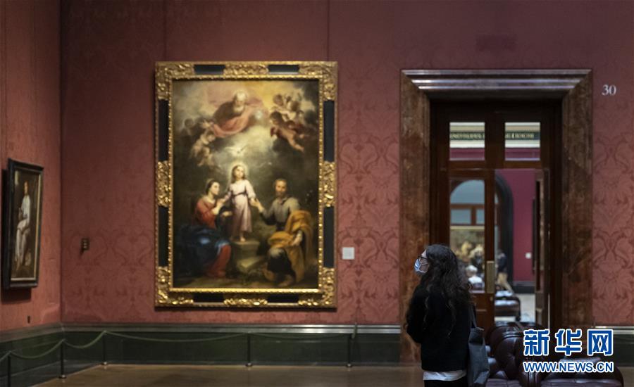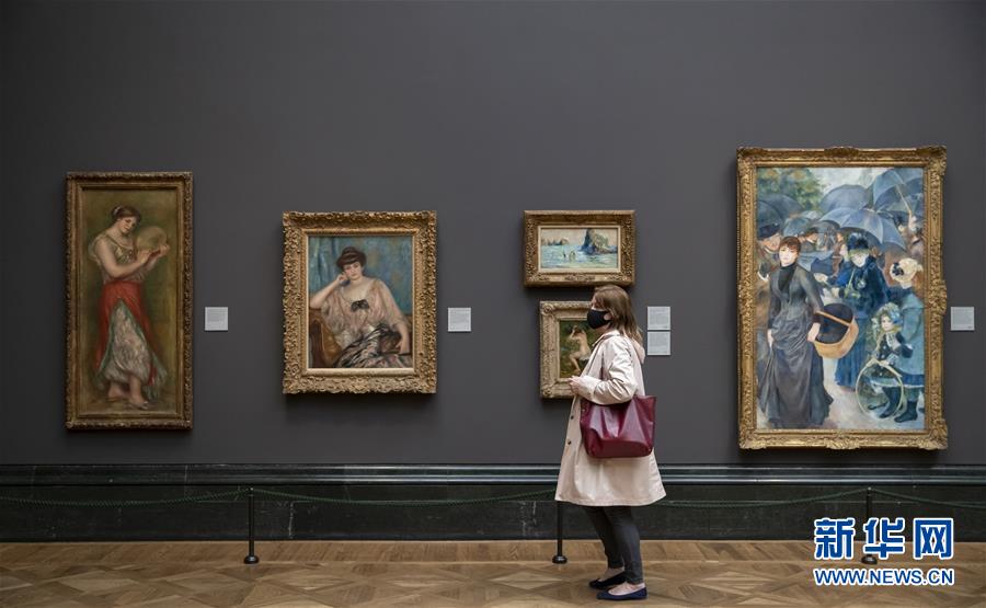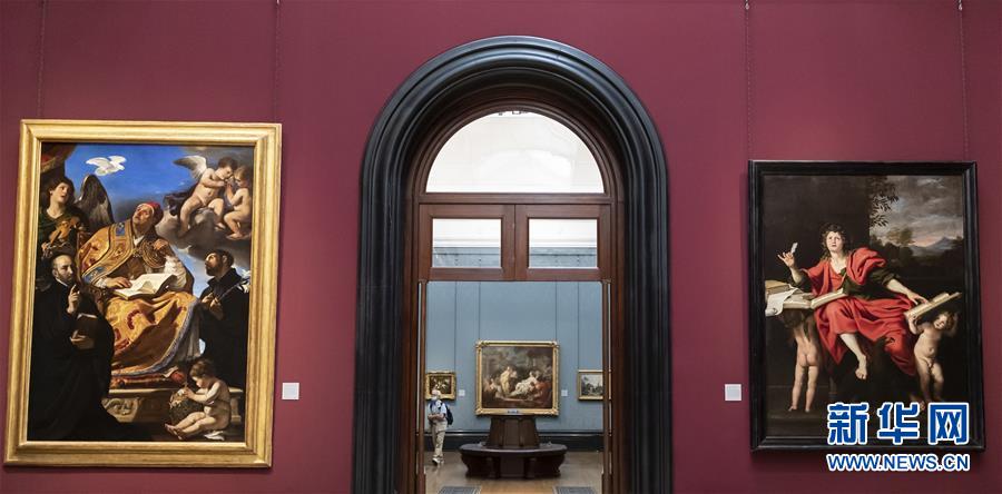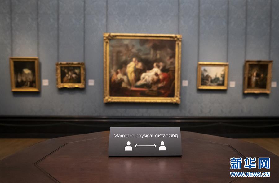 7月4日,參觀者佩戴口罩在英國國家美術館的媒體開放日上參觀。受新冠疫情影響而關閉的英國國家美術館將于7月8日重新對公眾開放,成為倫敦首批開門迎客的博物館、美術館。參觀者需提前網上預約參觀時段,全程佩戴口罩且保持安全距離。新華社記者韓巖攝