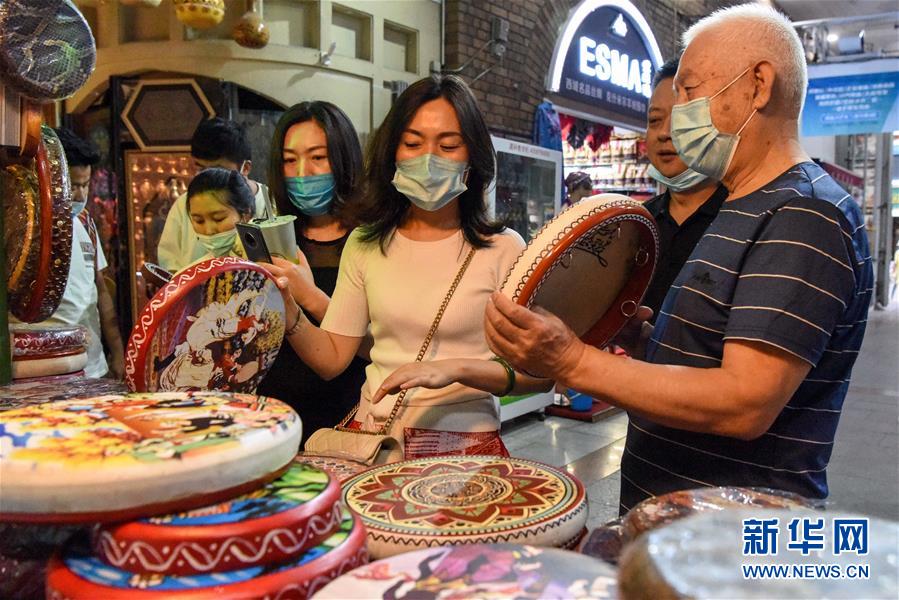 游客在烏魯木齊大巴扎景區(qū)購買手鼓(7月4日攝)。夏日周末,烏魯木齊市大巴扎景區(qū)內(nèi)熙熙攘攘,人們來到這里品嘗美食、休閑購物。2018年,經(jīng)過靚化改造后的大巴扎景區(qū)新增長約800米的步行街,分為文創(chuàng)文旅和“非遺”項目街區(qū)、國際時尚街區(qū)和大巴扎美食街區(qū),是烏魯木齊最受歡迎的旅游目的地之一。新華社記者丁磊攝