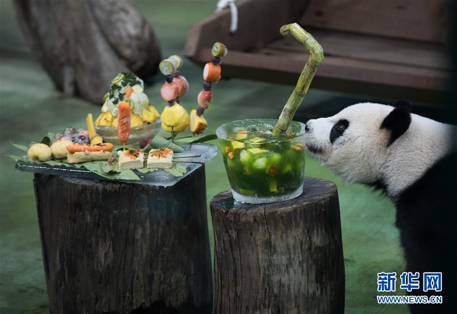 7月6日,在臺北市立動物園,大熊貓“圓仔”正在品嘗特制的生日蛋糕。新華社記者金立旺攝