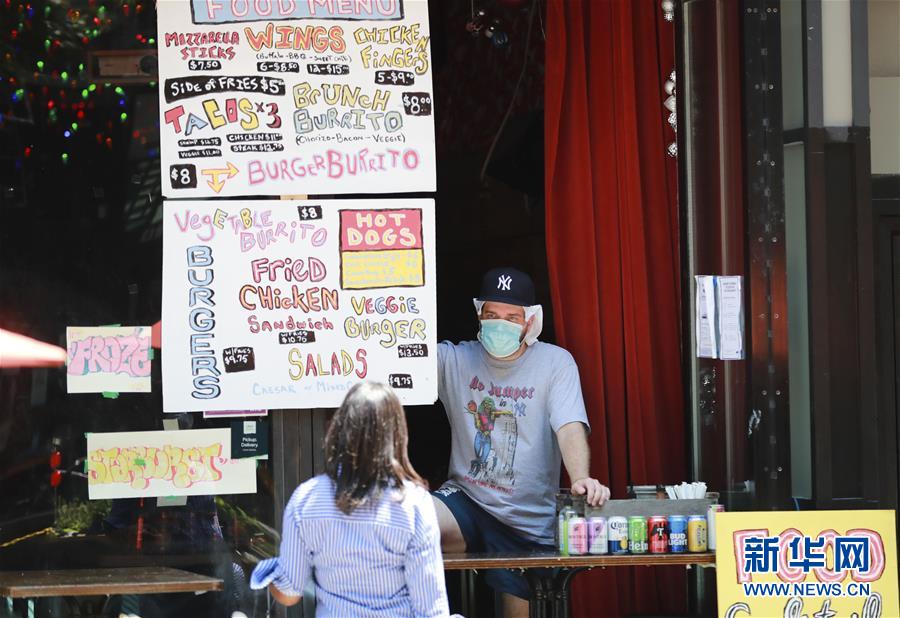 7月6日,美國(guó)紐約一家餐廳的服務(wù)人員與顧客交談。新華社記者王迎攝