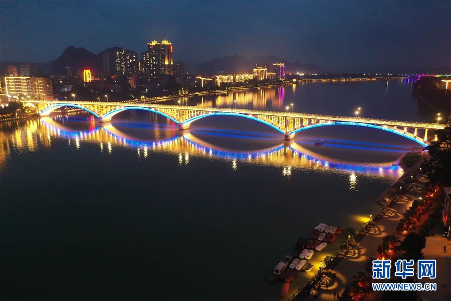 這是融安縣城夜色(7月7日攝,無(wú)人機(jī)照片)。夏夜的廣西融安縣城燈火璀璨,景色迷人。新華社記者張愛(ài)林?jǐn)z