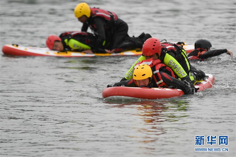 7月7日,吳興區(qū)消防救援大隊(duì)隊(duì)員在演練水上救援,以備搶險。近日,位于浙江北部的湖州市遭遇多輪降雨,東部平原河網(wǎng)普遍超警戒水位,水庫山塘高位運(yùn)行。7月5日12時30分,湖州市人民政府防汛防旱指揮部將防汛應(yīng)急響應(yīng)提升至Ⅲ級,要求各地密切監(jiān)測汛情,切實(shí)做好各項(xiàng)防范工作,確保安全度汛。新華社記者黃宗治攝