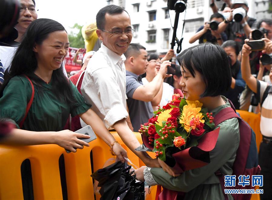 7月8日,一名考生(右)在湖南省長(zhǎng)沙市一中考點(diǎn)外從家長(zhǎng)手中接過(guò)鮮花。當(dāng)日,全國(guó)部分地區(qū)2020年高考結(jié)束。新華社記者薛宇舸攝