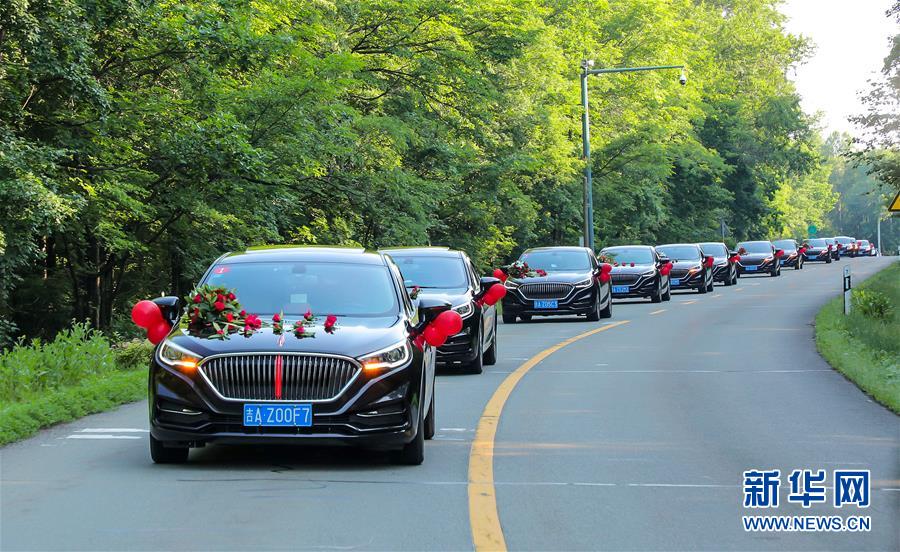 7月8日,載有新人的車(chē)輛前往長(zhǎng)白山北景區(qū)婚禮現(xiàn)場(chǎng)。新華社記者林宏攝