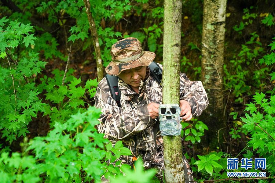 董紅雨在迎春林業(yè)局有限公司施業(yè)區(qū)內(nèi)查看架設(shè)在樹(shù)上用于拍攝野生東北虎蹤跡的遠(yuǎn)紅外相機(jī)(7月8日攝)。新華社記者王松攝