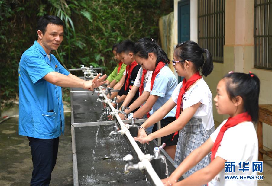 7月8日,陶雷為長(zhǎng)垌小學(xué)的學(xué)生講解科學(xué)洗手的方法。新華社記者周華攝