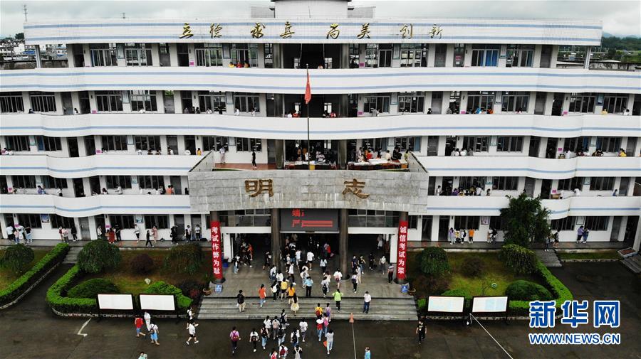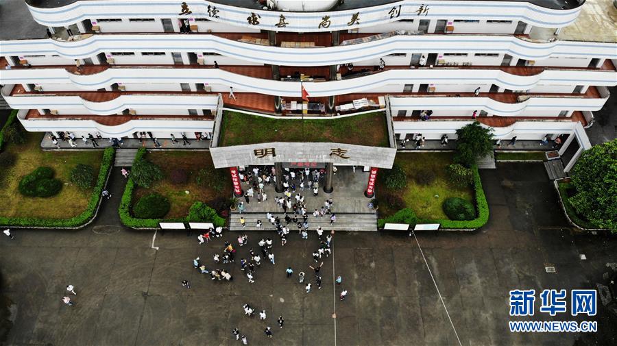 7月9日,考生進入歙縣第二中學(xué)考點(無人機照片)。受強降雨影響,2020年高考安徽歙縣考區(qū)7月7日未能如期開考,經(jīng)研究并報教育部批準(zhǔn),歙縣考區(qū)于9日啟用2020年普通高等學(xué)校招生全國統(tǒng)一考試語文、數(shù)學(xué)(文、理)科目副題進行考試。新華社記者黃博涵攝