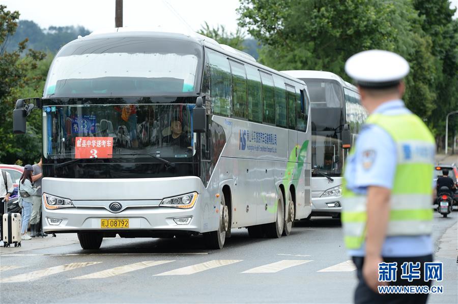 7月9日,接送考生的大巴車抵達歙縣第二中學(xué)考點。受強降雨影響,2020年高考安徽歙縣考區(qū)7月7日未能如期開考,經(jīng)研究并報教育部批準(zhǔn),歙縣考區(qū)于9日啟用2020年普通高等學(xué)校招生全國統(tǒng)一考試語文、數(shù)學(xué)(文、理)科目副題進行考試。新華社記者黃博涵攝