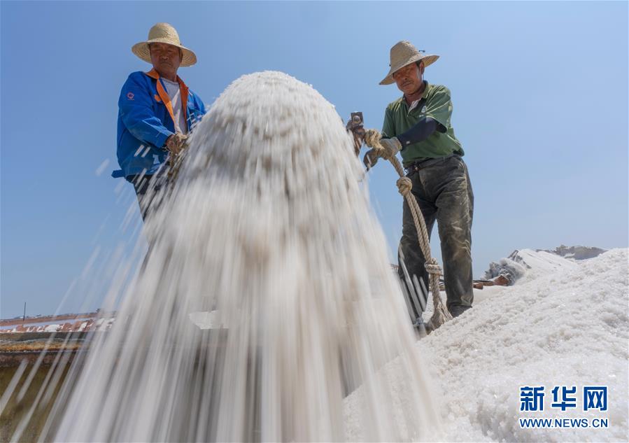 7月9日,唐山市曹妃甸區(qū)南堡鹽場(chǎng)的工人將收獲的春鹽裝船。在我國(guó)長(zhǎng)蘆鹽區(qū)海鹽生產(chǎn)基地之一的河北省唐山市曹妃甸區(qū)南堡鹽場(chǎng),一年一度的春鹽收獲工作即將結(jié)束,今年南堡鹽場(chǎng)的春鹽產(chǎn)量預(yù)計(jì)可達(dá)72萬噸。新華社記者楊世堯攝