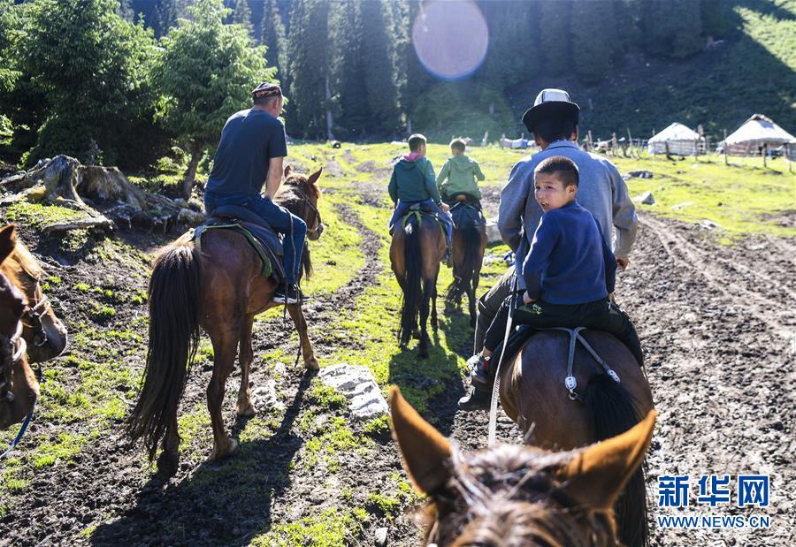 在新疆特克斯縣境內(nèi)的夏牧場(chǎng)里,小朋友跟隨家人一起放牧(6月30日攝)。新華社記者王菲攝