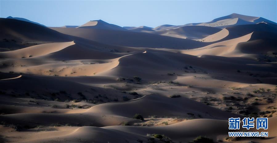 這是7月8日拍攝的騰格里沙漠風(fēng)光。位于內(nèi)蒙古自治區(qū)阿拉善左旗西南部和甘肅省中部邊境的騰格里沙漠是我國(guó)第四大沙漠,總面積約為4.3萬平方公里。夏日傍晚,騰格里沙漠連綿的沙丘被日光勾勒出美麗的線條,美不勝收。新華社記者連振攝
