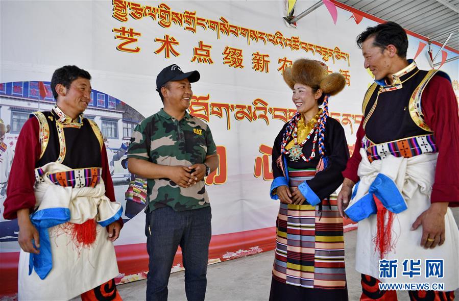 山南市扎囊縣桑耶鎮(zhèn)乃卡村第一書記、駐村工作隊(duì)隊(duì)長次仁羅布(左二)和村文藝演出隊(duì)演員交流(7月7日攝)。新華社記者張汝鋒攝