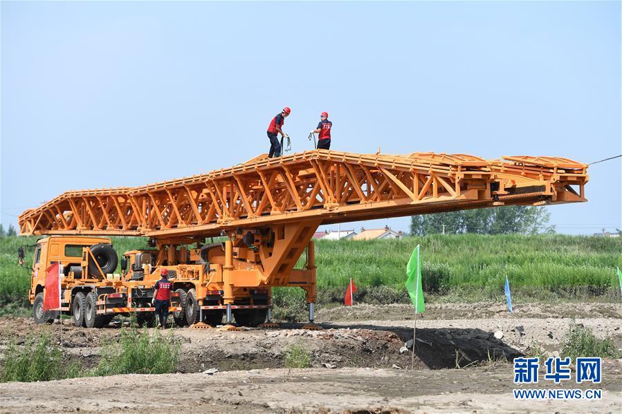 7月10日,工作人員在演練現(xiàn)場(chǎng)搭建機(jī)械化橋梁。當(dāng)日,由吉林省交通運(yùn)輸廳主辦的公路橋梁水毀搶通應(yīng)急演練在長(zhǎng)春市雙陽(yáng)區(qū)雙陽(yáng)河舉行,參與演練人員從汛情水毀信息報(bào)送、應(yīng)急裝備快速集結(jié)、機(jī)械化橋梁搶通搭設(shè)、善后處理等方面進(jìn)行實(shí)戰(zhàn)演練。新華社記者張楠攝