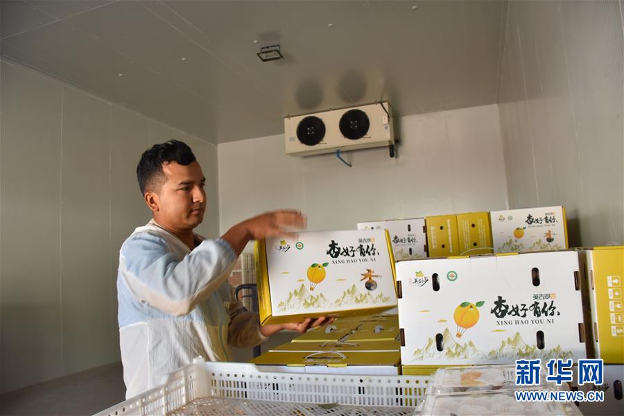 在新疆英吉沙縣一家合作社內,員工將包裝好的杏子放入冷庫(7月3日攝)。新華社記者高晗攝