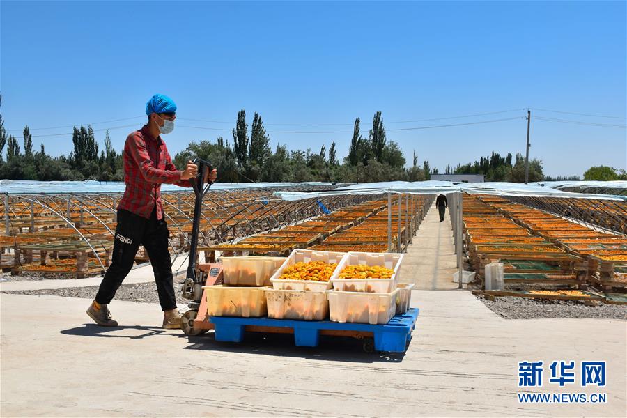 在新疆英吉沙縣一家合作社內,員工在晾曬杏子(7月2日攝)。新華社記者高晗攝