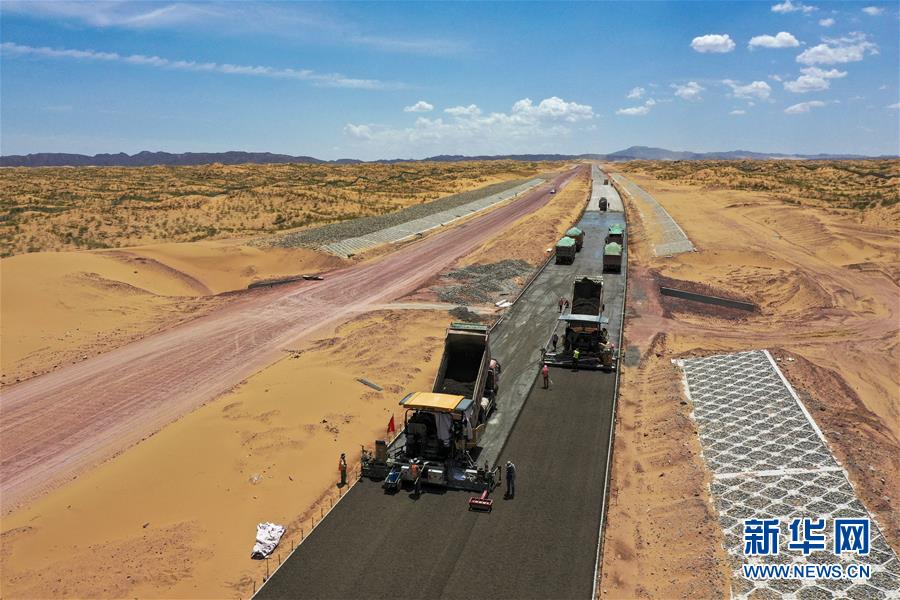 7月10日,位于寧夏境內(nèi)的烏瑪高速青銅峽至中衛(wèi)段A10標段在施工中(無人機照片)。盛夏時節(jié),位于寧夏境內(nèi)的烏瑪(內(nèi)蒙古烏海市至青?,斍呖h)高速青銅峽至中衛(wèi)段正在抓緊施工建設。該路段主線全長122.9公里,其中穿越騰格里沙漠腹地的18公里公路是寧夏建設的首條沙漠高速公路,預計2021年建成通車。新華社記者馮開華攝。