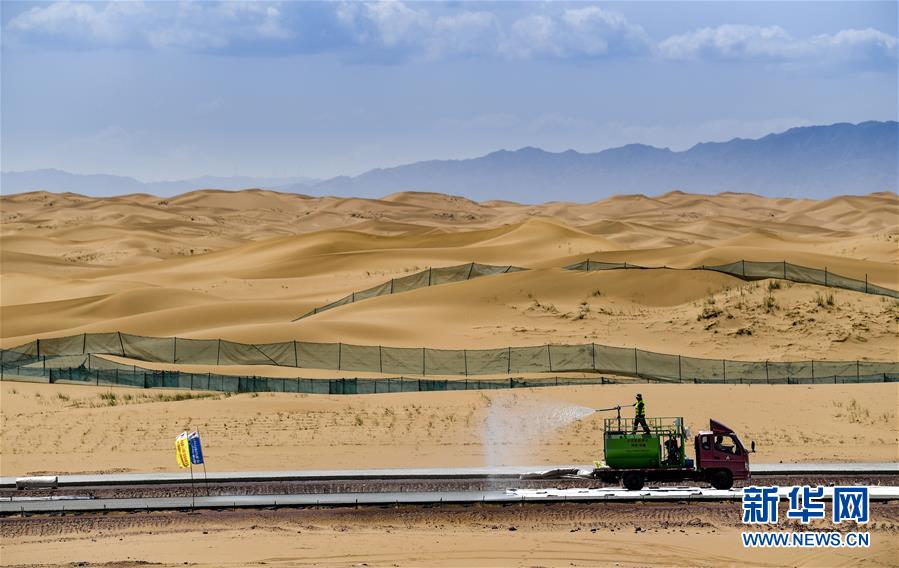 7月10日,工人在位于寧夏境內(nèi)的烏瑪高速青銅峽至中衛(wèi)段A9標段施工。盛夏時節(jié),位于寧夏境內(nèi)的烏瑪(內(nèi)蒙古烏海市至青?,斍呖h)高速青銅峽至中衛(wèi)段正在抓緊施工建設。該路段主線全長122.9公里,其中穿越騰格里沙漠腹地的18公里公路是寧夏建設的首條沙漠高速公路,預計2021年建成通車。新華社記者馮開華攝。
