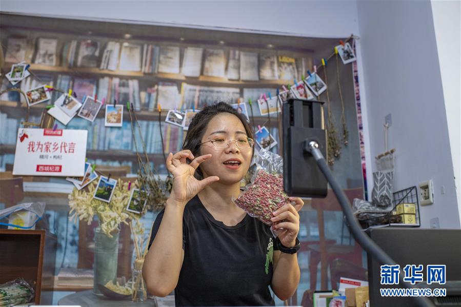 在位于新疆精河縣城的工作室內(nèi),朱虹美通過手機(jī)向網(wǎng)友介紹真空包裝的枸杞產(chǎn)品(7月11日攝)。新華社記者 胡虎虎 攝