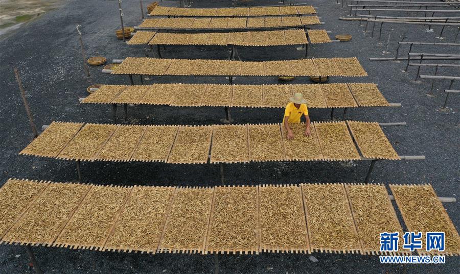 7月12日,祁東縣黃土鋪鎮(zhèn)雷公殿村,村民在晾曬黃花菜(無人機(jī)照片)。新華社記者 趙眾志 攝