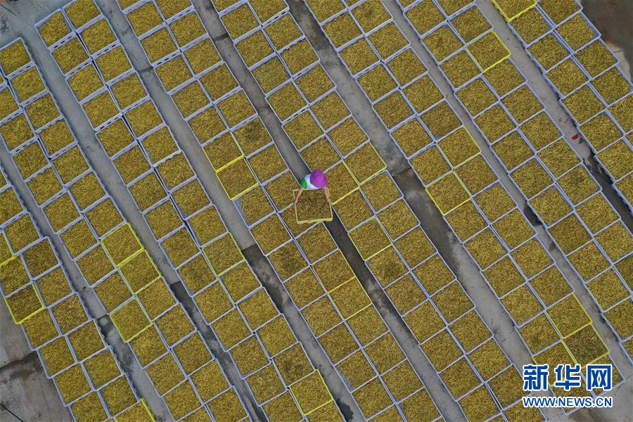 7月12日,祁東縣黃土鋪鎮(zhèn)雁隆食品公司內(nèi),工人在晾曬黃花菜(無人機照片)。新華社記者 趙眾志 攝