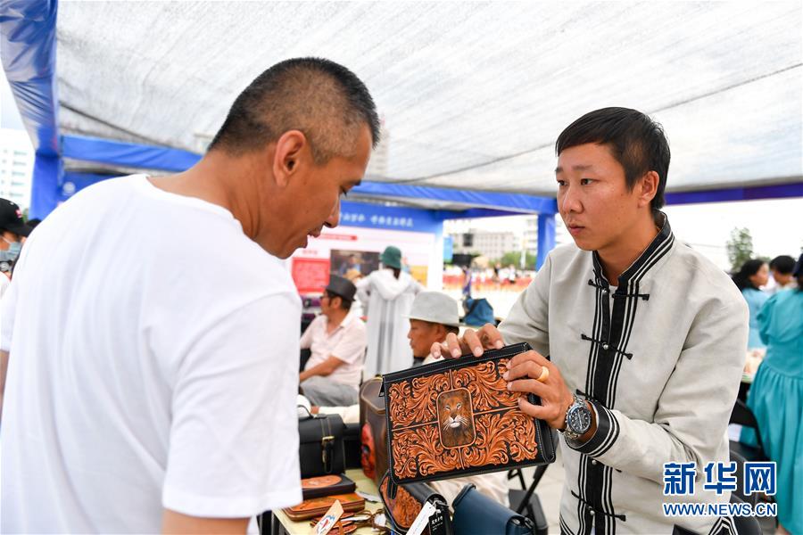 7月12日,在內蒙古呼倫貝爾市海拉爾區(qū)惠民展演活動的非遺展區(qū),參展商(右)向游客介紹蒙古族皮雕商品。新華社記者 貝赫 攝