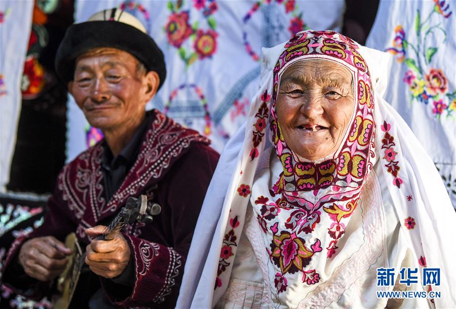 在新疆伊犁特克斯縣境內(nèi)的夏牧場(chǎng)里,兩位老人在氈房?jī)?nèi)彈奏冬不拉唱歌(7月2日攝)。新華社記者 王菲 攝