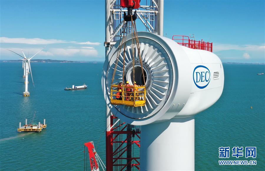 福建福清興化灣二期海上風(fēng)電場吊裝10兆瓦海上風(fēng)電機(jī)組(6月12日攝,無人機(jī)照片)。記者7月13日從三峽集團(tuán)了解到,國內(nèi)首臺10兆瓦海上風(fēng)電機(jī)組日前在三峽集團(tuán)福建福清興化灣二期海上風(fēng)電場成功并網(wǎng)發(fā)電,這是目前我國自主研發(fā)的單機(jī)容量亞太地區(qū)最大、全球第二大的海上風(fēng)電機(jī)組,刷新了我國海上風(fēng)電單機(jī)容量新紀(jì)錄。新華社記者 林善傳 攝