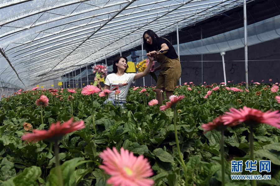 7月10日,在莒縣招賢鎮(zhèn)西黃埠村盛世花卉種植專(zhuān)業(yè)合作社,駐村第一書(shū)記鐘翠娟(左)在扶郎花種植大棚進(jìn)行網(wǎng)上直播。山東省日照市莒縣招賢鎮(zhèn)有20余年的玫瑰花、扶郎花種植歷史。目前,招賢鎮(zhèn)投資建設(shè)的高標(biāo)準(zhǔn)特色鮮花種植大棚可年產(chǎn)700-800萬(wàn)枝優(yōu)質(zhì)玫瑰和扶郎花等,帶動(dòng)周邊鄉(xiāng)鎮(zhèn)的建檔立卡貧困戶(hù)脫貧增收。新華社記者 范長(zhǎng)國(guó) 攝