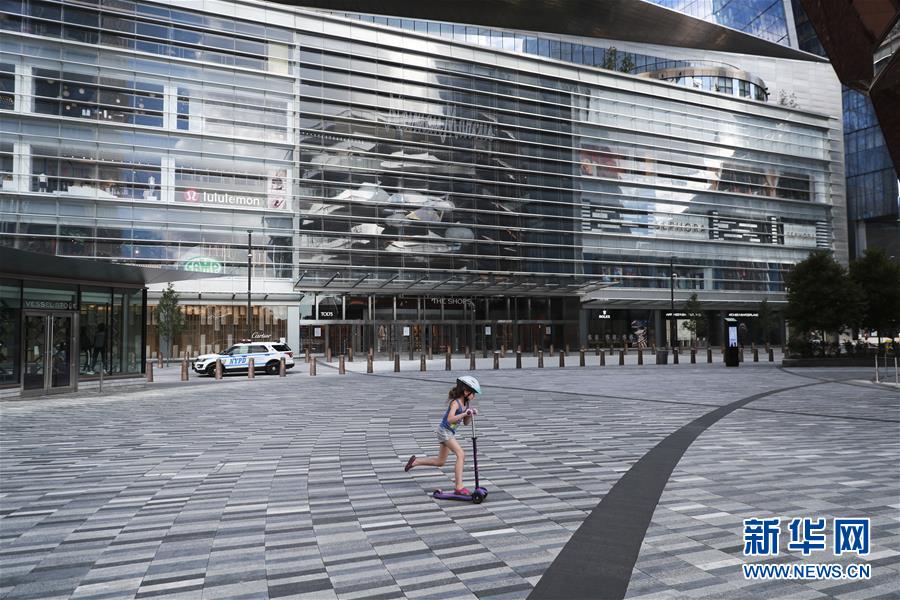 7月14日,在美國紐約一家尚未恢復店內購物的購物中心外,一名女孩在空曠的廣場上玩耍。美國約翰斯·霍普金斯大學:截至北京時間15日6時34分,全球新冠確診病例達13258016例,死亡病例為576752例。美國是全球疫情最嚴重的國家,確診病例達3416222例,死亡病例為136319例。新華社記者 王迎 攝