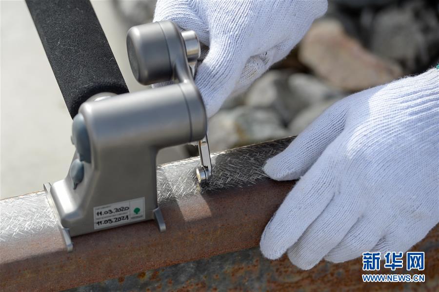 技術員用儀器進行鋼軌廓形檢測(7月14日攝)。新華社記者 丁磊 攝