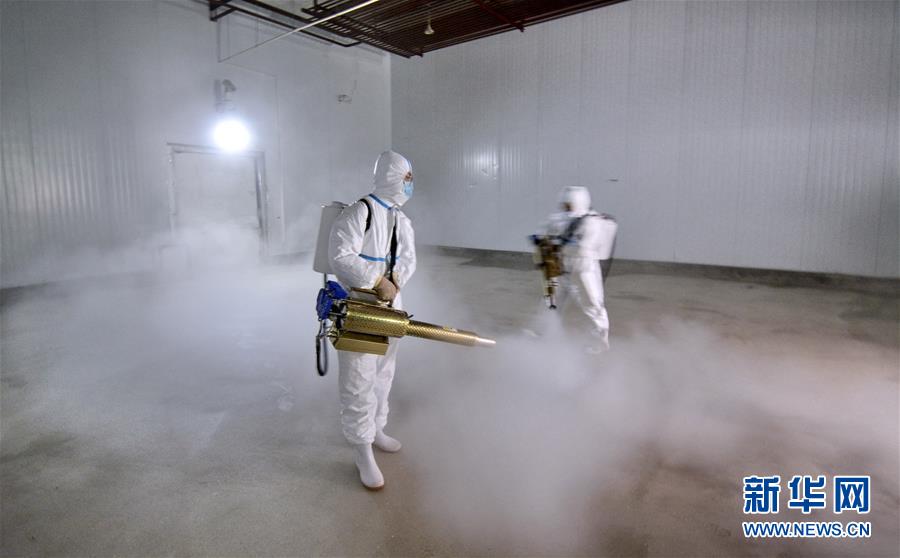 7月14日,北京二商肉類食品集團(tuán)有限公司員工對(duì)肉類冷藏庫(kù)房進(jìn)行全方位消毒。北京二商肉類食品集團(tuán)有限公司是保障北京肉類市場(chǎng)供應(yīng)的主要企業(yè)之一。新冠肺炎疫情以來(lái),企業(yè)嚴(yán)格實(shí)施北京市、農(nóng)業(yè)農(nóng)村部和中國(guó)肉類協(xié)會(huì)的防疫要求,對(duì)進(jìn)入廠區(qū)的人員、車輛以及原料采購(gòu)、屠宰分割、產(chǎn)品加工、貯藏運(yùn)輸、廢棄物收集及污水處理等生產(chǎn)環(huán)節(jié)嚴(yán)格防疫,強(qiáng)調(diào)源頭把關(guān)徹底消毒。目前,集團(tuán)公司下屬多家生豬屠宰加工基地正常運(yùn)營(yíng),保質(zhì)保量供應(yīng)北京市場(chǎng)需求。新華社記者 李欣 攝