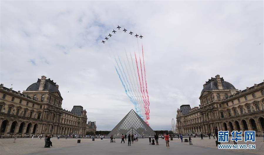 7月14日,“法蘭西巡邏兵”飛行表演隊(duì)飛過(guò)法國(guó)巴黎盧浮宮玻璃金字塔廣場(chǎng)。法國(guó)一年一度的國(guó)慶閱兵式14日在巴黎舉行。受疫情影響,法國(guó)總統(tǒng)馬克龍沒(méi)有在香榭麗舍大街舉行國(guó)慶閱兵式,而是在協(xié)和廣場(chǎng)舉行小型慶祝儀式,向在抗疫斗爭(zhēng)中做出貢獻(xiàn)的公民致敬。新華社記者高靜攝