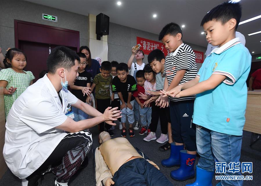 7月16日,學(xué)生們?cè)跂|林鎮(zhèn)衛(wèi)生院醫(yī)護(hù)人員的示范和講解下學(xué)習(xí)正確洗手的方法。當(dāng)日,浙江省湖州市吳興區(qū)東林鎮(zhèn)舉辦暑期“安全防護(hù)小超人”主題活動(dòng)。活動(dòng)由醫(yī)護(hù)人員、消防隊(duì)員等為學(xué)生及家長(zhǎng)講授日常安全避險(xiǎn)及溺水急救知識(shí),中小學(xué)們還在現(xiàn)場(chǎng)學(xué)習(xí)了簡(jiǎn)易包扎、心肺復(fù)蘇的正確方式,并了解滅火器、滅火毯等消防器材的使用,為學(xué)生平安過(guò)暑期打好安全防護(hù)“預(yù)防針”。新華社記者 徐昱 攝