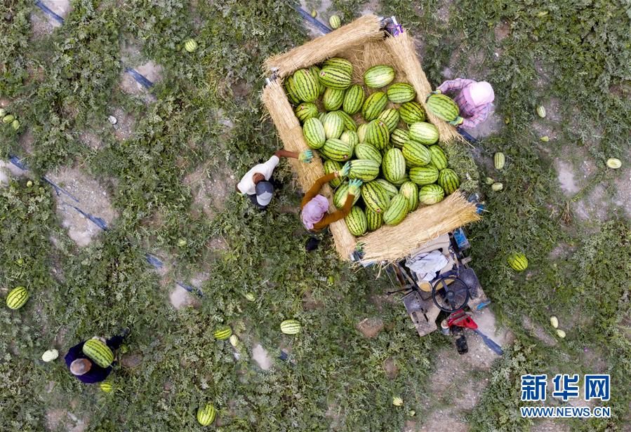 7月16日,在寧夏中衛(wèi)市香山鄉(xiāng)硒砂瓜萬畝示范基地,瓜農(nóng)將采收的西瓜裝車(無人機照片)。近日,寧夏中衛(wèi)市迎來硒砂瓜豐收季。硒砂瓜是中衛(wèi)市的特色農(nóng)產(chǎn)品,近年來,當?shù)夭扇〖夹g(shù)創(chuàng)新、規(guī)模化種植、休耕輪作等多項舉措,讓硒砂瓜種植成為當?shù)剞r(nóng)民增收致富的重要產(chǎn)業(yè)。據(jù)了解,今年中衛(wèi)市硒砂瓜種植面積為69.7萬畝。新華社記者楊植森攝