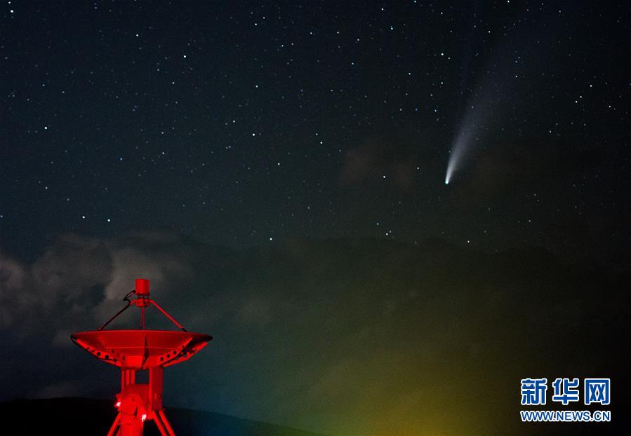 7月18日晚,在明安圖觀測(cè)基地,尼歐懷茲彗星劃過(guò)天際。7月18日晚至19日凌晨,在位于內(nèi)蒙古錫林郭勒盟正鑲白旗境內(nèi)的國(guó)家天文臺(tái)明安圖觀測(cè)基地,尼歐懷茲彗星劃過(guò)天際。在明安圖觀測(cè)基地內(nèi),排列著100面白色的拋物面天線(xiàn)。這個(gè)龐大的天線(xiàn)陣列便是草原“天眼”——明安圖射電頻譜日像儀。草原“天眼”持續(xù)接收太陽(yáng)射電輻射,然后由科研人員進(jìn)行數(shù)據(jù)分析研究,對(duì)空間環(huán)境監(jiān)測(cè)、太陽(yáng)活動(dòng)預(yù)報(bào)均有重要作用。新華社記者連振攝