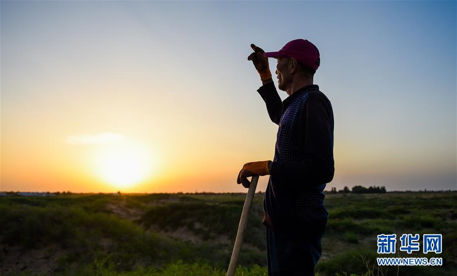 7月7日,孟和巴依爾站在改造后的荒灘上,遠望騰格里沙漠。1993年,孟和巴依爾看到家鄉(xiāng)內(nèi)蒙古阿拉善盟阿拉善左旗超格圖呼熱蘇木由于過度放牧,草場嚴重退化,于是,他與家人在家鄉(xiāng)承包了4000多畝草場進行治沙造林。27年過去,孟和巴依爾一家承包的草場已從曾經(jīng)生態(tài)脆弱的沙化土地變成了如今的茵茵綠洲。新華社記者連振攝